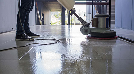 Premium floor scrubbing and polishing service to restore shine and remove deep stains from marble, granite and tile floors using professional machines.